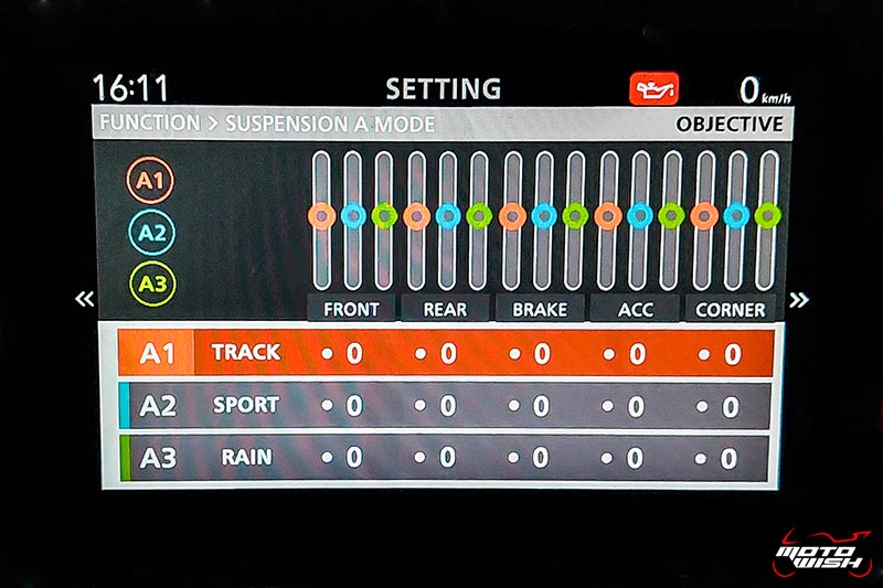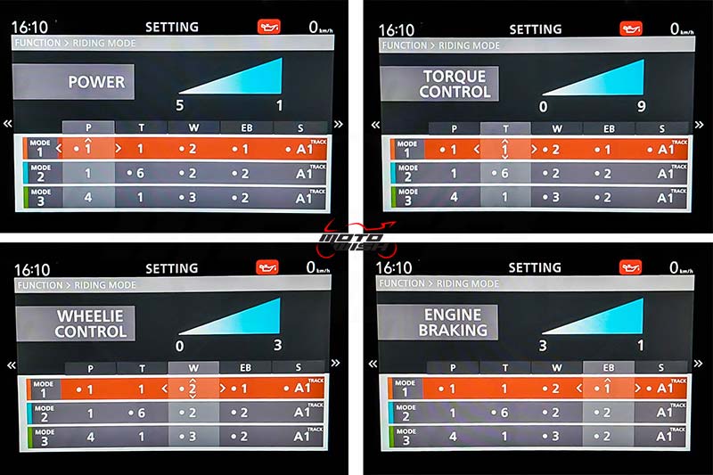 - W (Wheelie Control): Có thể điều chỉnh 3 mức độ hoặc tắt, từ 1 (thấp nhất) đến 3 (cao nhất).